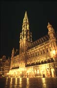 Back to the Grande Place in Brussells, this photograph was taken on a stormy night with almost no one in the normally crowded square. This is the town hall, the spire of which is seen in the first picture above. The gold color is a result of the use of low-pressure sodium vapor lighting, used widely throughout Belgium. I took two pictures that night, the other with my Nikkormat using Ektachrome. Kodachrome and Ektachrome can react very differently to narrow-spectrum light sources like this: neither accurately renders the strange colors. Kodachrome will often display this golden color, not entirely unattractive, while Ektachrome rendered the building a most unattractive olive green, almost the color of bile.