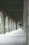 About 100 km southeast of Brussels, near the city of Namen (Namur), is the Abbey of Maredsous. New by European standards (less than 200 years old), it's a peaceful retreat. Tourist are invited to stop by. I was there one sunny summer afternoon and, upon entering the courtyard, was intrigued by the large numbers of people sitting and, well, sprawled on the grass, sleeping. We walked around the abbey and, finally, found our way to the cafeteria, where they served thick sandwiches of smoked ham and cheese on dense, heavy bread, along with a big mug of beer made by the monks. The sandwich was hearty and fillng, and the beer was thick and heady, not at all unpleasant, and quite strong. A very satisfying meal, to be sure. When we were done, we strolled out onto the grass and sat down for a brief rest before setting off, and were quite surprised to find ourselves waking up from an hour-long nap. Those monks make a killer brew, to be sure. The shot you see here is of the long, covered walkway where the monks can be seen strolling, saying their daily prayers.