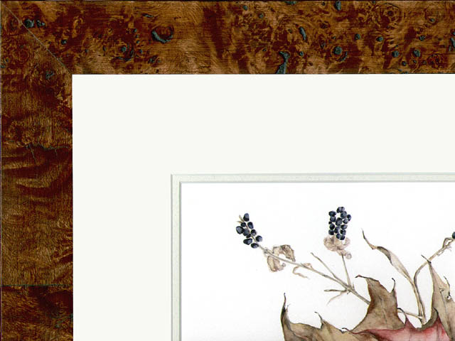 Many of the works seen on this site, as well as others by Ms. Pierce, are professionally mounted on acid-free, archival mats, protected by museum-quality, UV-blocking glass and are in high-quality frames made of exotic materials such as wood burls.